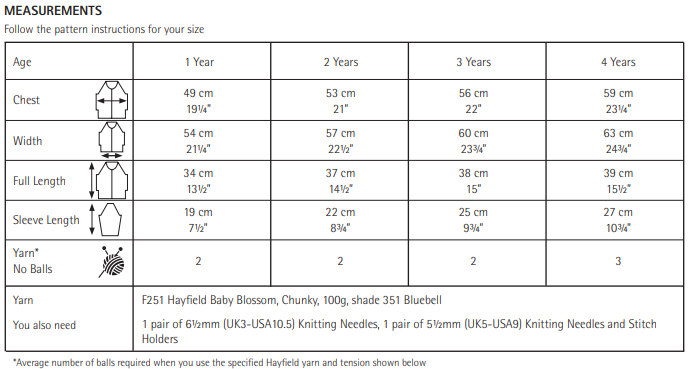 This Hayfield Baby Blossom Chunky Sweater 5567 is perfect for your next project and requires 2 - 3 balls of yarn to complete. It would suit an Intermediate Knitter.